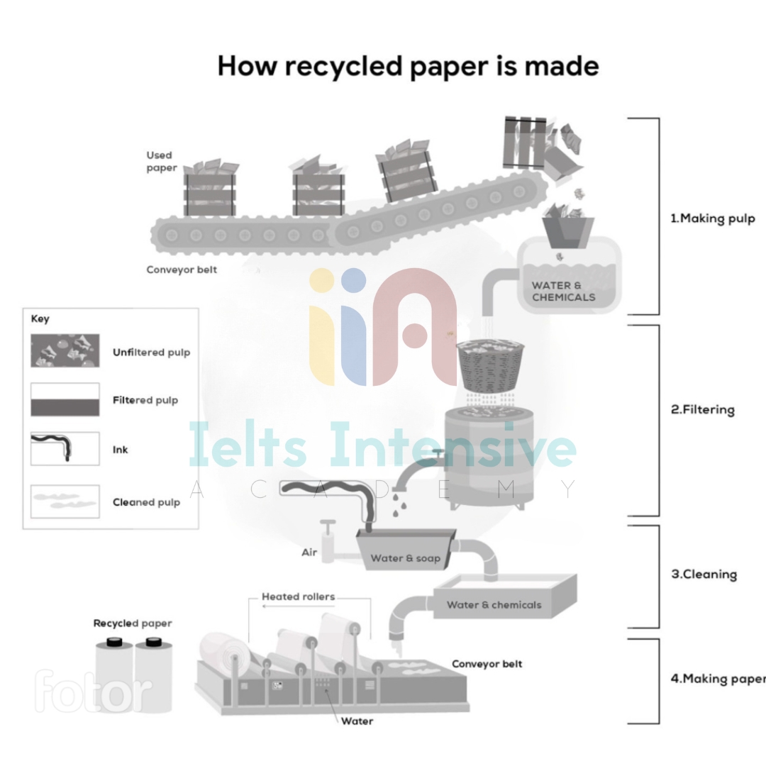 Task 1: The diagram below shows how recycled paper is made. Summarise the information by selecting and reporting the main features, and make comparisons where relevant.