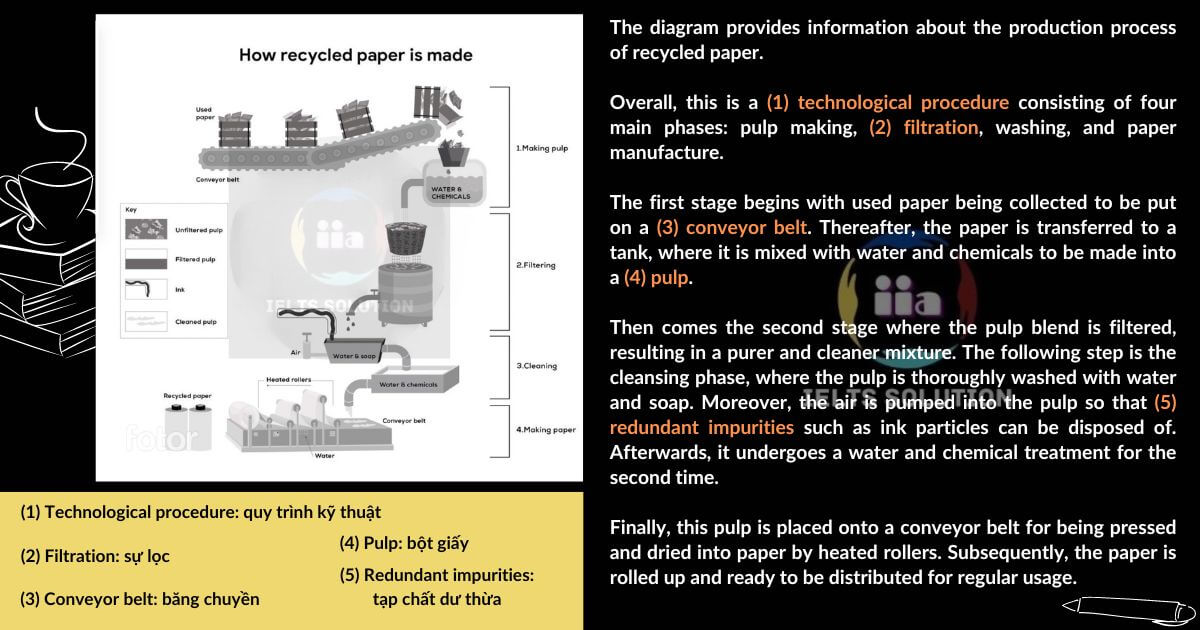 Mẫu bài Writing sẽ giúp các bạn đang ôn thi IELTS có tài liệu thực hành, học từ vựng qua các áp dụng thực tế, vận dụng ngữ pháp và cách triển khai các ý theo trình tự trong bài văn Writing trong kỳ thi IELTS. Bài mẫu Writing task 1 đề thi ngày 06/01/2024 với dạng đề sơ đồ cho thấy giấy tái chế được sản xuất như thế nào. Hãy cùng IIA phân tích đề bài và tham khảo bài mẫu sau đây: