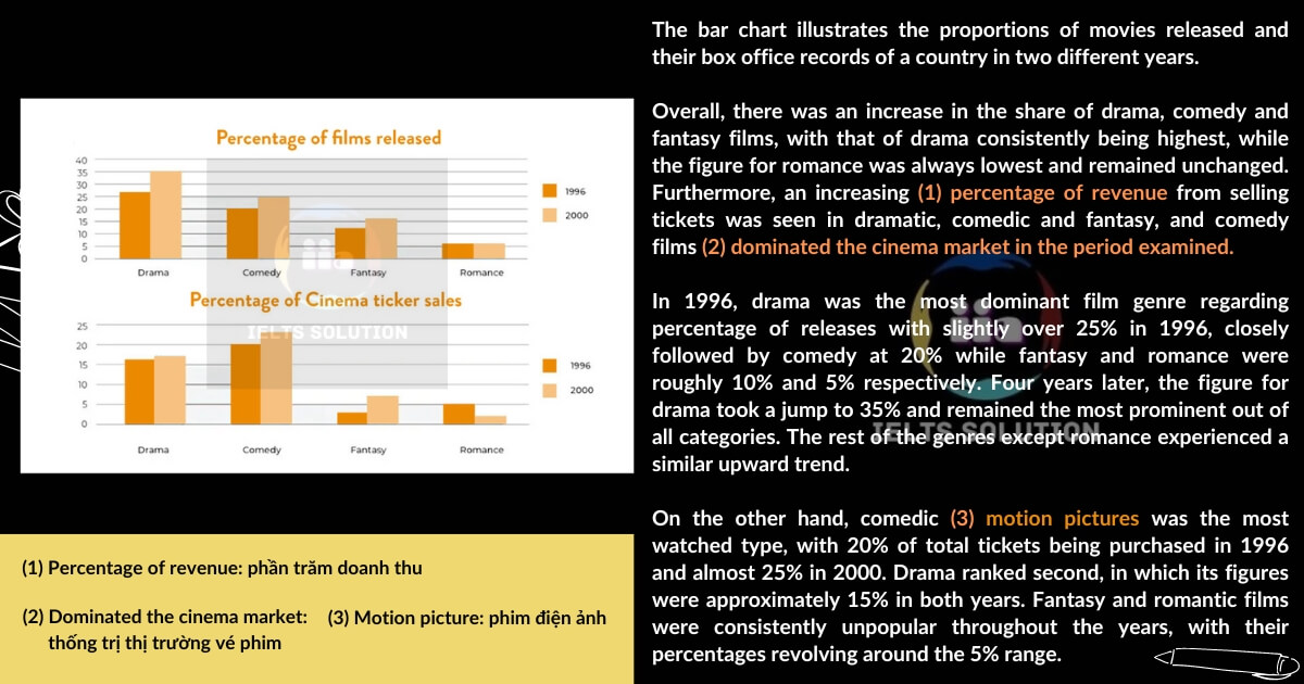 Mẫu bài Writing sẽ giúp các bạn đang ôn thi IELTS có tài liệu thực hành, học từ vựng qua các áp dụng thực tế, vận dụng ngữ pháp và cách triển khai các ý theo trình tự trong bài văn Writing trong kỳ thi IELTS. Bài mẫu Writing task 1 đề thi ngày 06/01/2024 với biểu đồ thể hiện tổng phần trăm phim được phát hành và tổng phần trăm doanh thu bán vé trong năm 1996 và 2000 tại một quốc gia. Hãy cùng IIA phân tích đề bài và tham khảo bài mẫu sau đây: