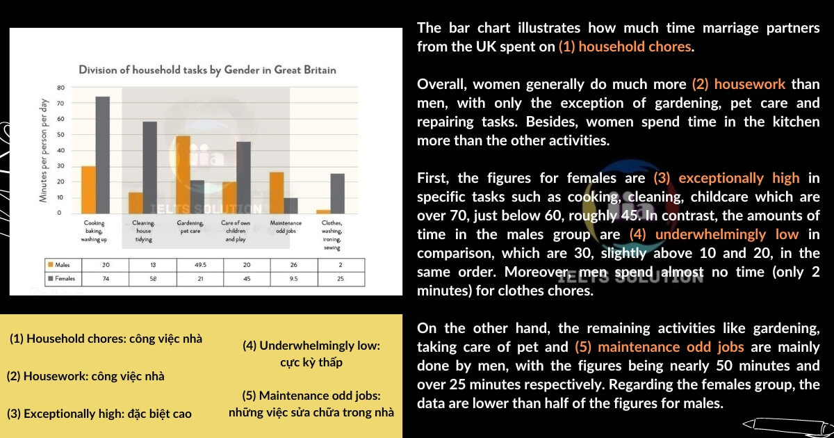 First, the figures for females are (3) exceptionally high in specific tasks such as cooking, cleaning, childcare which are over 70, just below 60, roughly 45. In contrast, the amounts of time in the males group are (4) underwhelmingly low in comparison, which are 30, slightly above 10 and 20, in the same order. Moreover, men spend almost no time (only 2 minutes) for clothes chores.