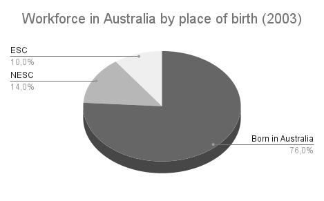 Regarding these workers's places of birth, (3) three quarters of them were native Australians. Meanwhile, the figures for NESC and ESC groups were far lower, at 14% and 10% respectively.