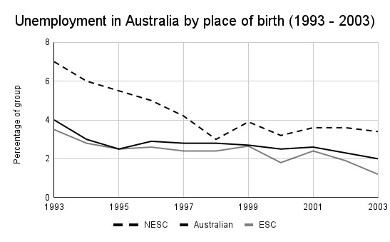 Turning to the percentage of individuals without jobs, roughly 7% of the people from non- English-speaking countries were unemployed in 1993. Despite experiencing a considerable decrease during the 20-year period, this figure remained the highest until 2003, which was approximately 3%. The rest of the workforce went through an (4) almost identical trend, (5) albeit less substantial, which dropped from the around the same starting point (roughly 4%) to about 1% for ESC and just/slightly below 2% for Australia.