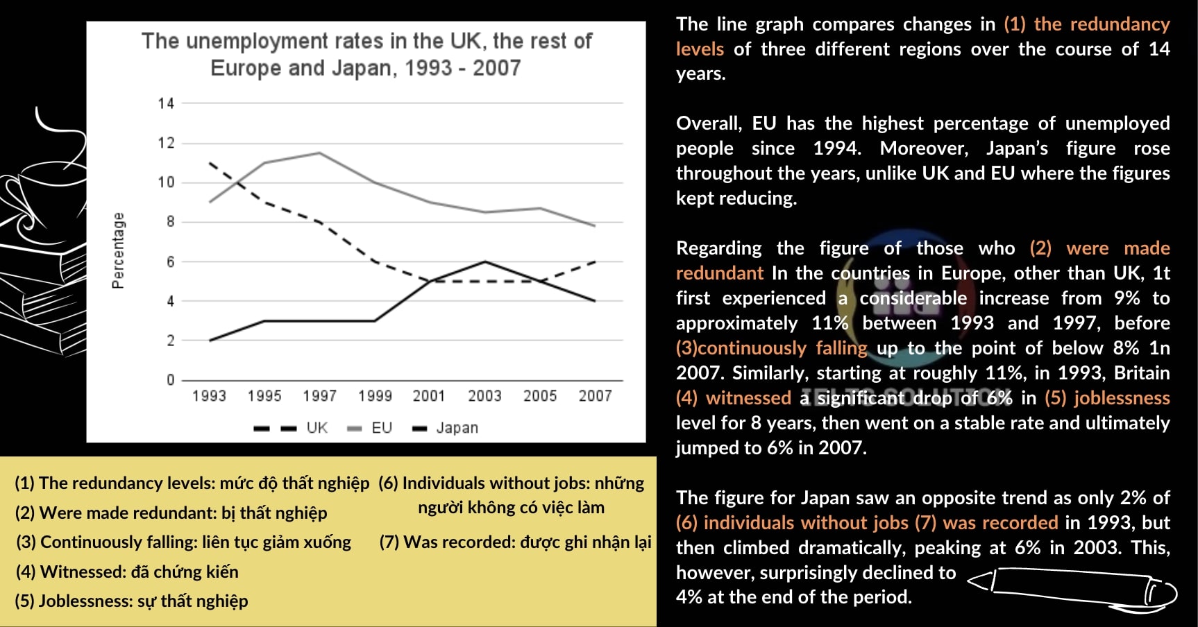 Tạo điều kiện cho các bạn làm quen, tích lũy từ vựng, ngữ pháp, cách phân tích bài và kinh nghiệm làm bài Writing trong kỳ thi IELTS. Bài mẫu Writing task 1 đề thi ngày 24/02/2024 với dạng đề biểu đồ đường (Line graph) thể hiện tỷ lệ thất nghiệp ở Anh, phần còn lại của Châu Âu và Nhật Bản từ năm 1993 đến năm 2007. Hãy cùng IIA phân tích đề bài và tham khảo bài mẫu sau đây: