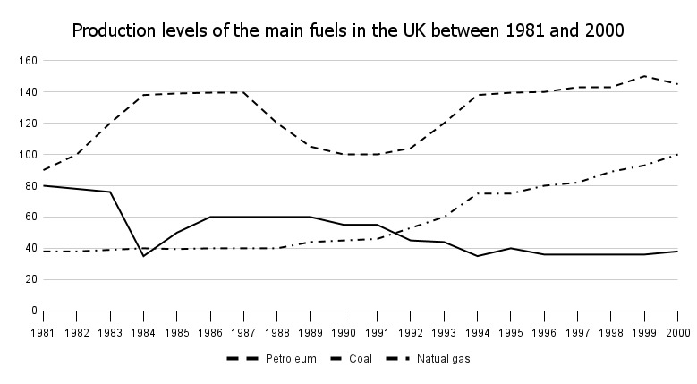 Task 1: The graph below shows the production levels of the main kinds of fuel in the UK between 1981 and 2000. Summarise the information by selecting and reporting the main features, and make comparisons where relevant.