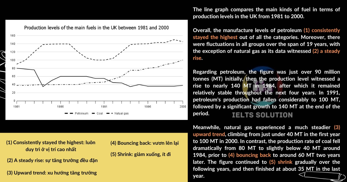Mẫu bài Writing sẽ giúp các bạn đang ôn thi IELTS có tài liệu thực hành, học từ vựng qua các áp dụng thực tế, vận dụng ngữ pháp và cách triển khai các ý theo trình tự trong bài văn Writing trong kỳ thi IELTS. Phần 5 bài mẫu Writing task 1 đề thi ngày 27/01/2024 với dạng đề Biểu đồ dưới đây cho thấy mức độ sản xuất các loại nhiên liệu chính ở Anh từ năm 1981 đến năm 2000. Hãy cùng IIA phân tích đề bài và tham khảo bài mẫu sau đây: